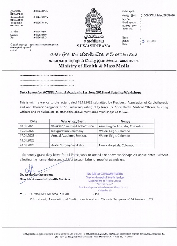 This 4th Satellite Symposium of the Annual Academic Congress of the Association of Cardiothoracic and Thoracic Surgeons of Sri Lanka brings together cutting-edge science, evolving evidence, and real-world clinical experience in a focused, hands-on workshop. Led by our distinguished resource person, Dr Ravi de Silva from Royal Papworth NHS Foundation Trust and the Cambridge Biomedical Campus - UK, the program includes wet lab training and surgically relevant insights from anaesthesia and radiology.
